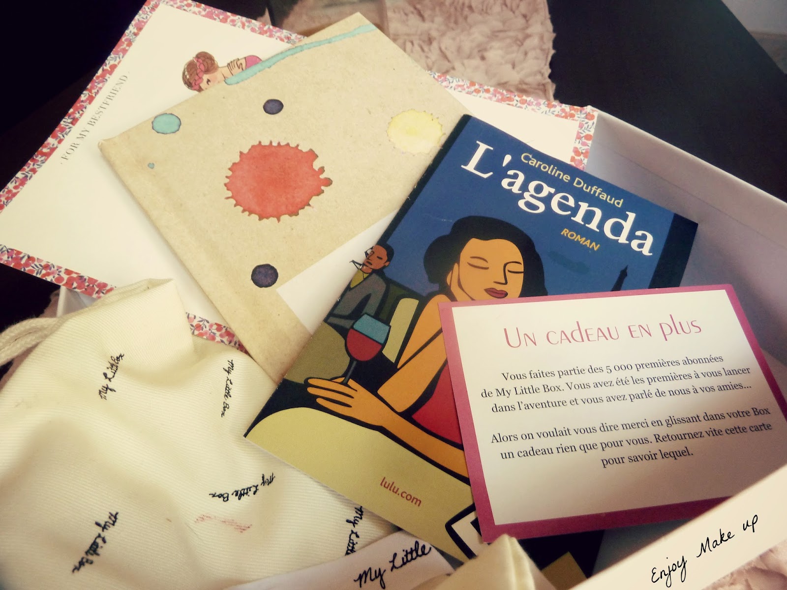 - Extrait du livre 'L'agenda' de Caroline Duffaud. Pour être sincère je n'ai pas encore eu le temps de le lire. Mais en général j'aime bien ce genre de roman. J'aurais bien aimé avoir le livre en entier quand même (oui je sais le but des boxs est de faire tester les produits ! lol). Par contre, le rapport avec la couleur ?..